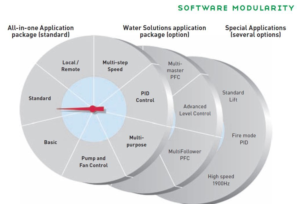 "All in One" é um pacote de aplicações único e que vem como standard nos conversores de frequência Vacon NXS. É parte das inovadoras soluções Vacon para fabricar conversores de alta simplicidade mas com elevada funcionalidade. Ele divide a lógica de funcionamento do conversor de frequência em pequenos blocos lógicos que são de fácil manuseamento e compreensão.